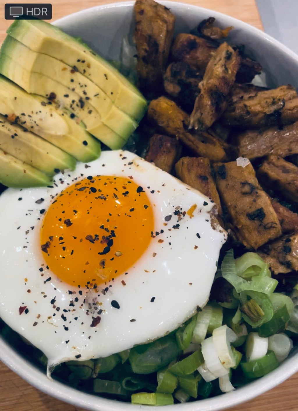 Für die Salatbowl ca. ein Viertel Eisbergsalat klein schneiden, in eine Schüssel geben und mit Essig und Öl marinieren. Die Pulled Chunks mit Öl anbraten, den Jungzwiebel klein schneiden und ebenfalls dünsten. Zwei Spiegeleier zubereiten und eine Avocado aufschneiden.