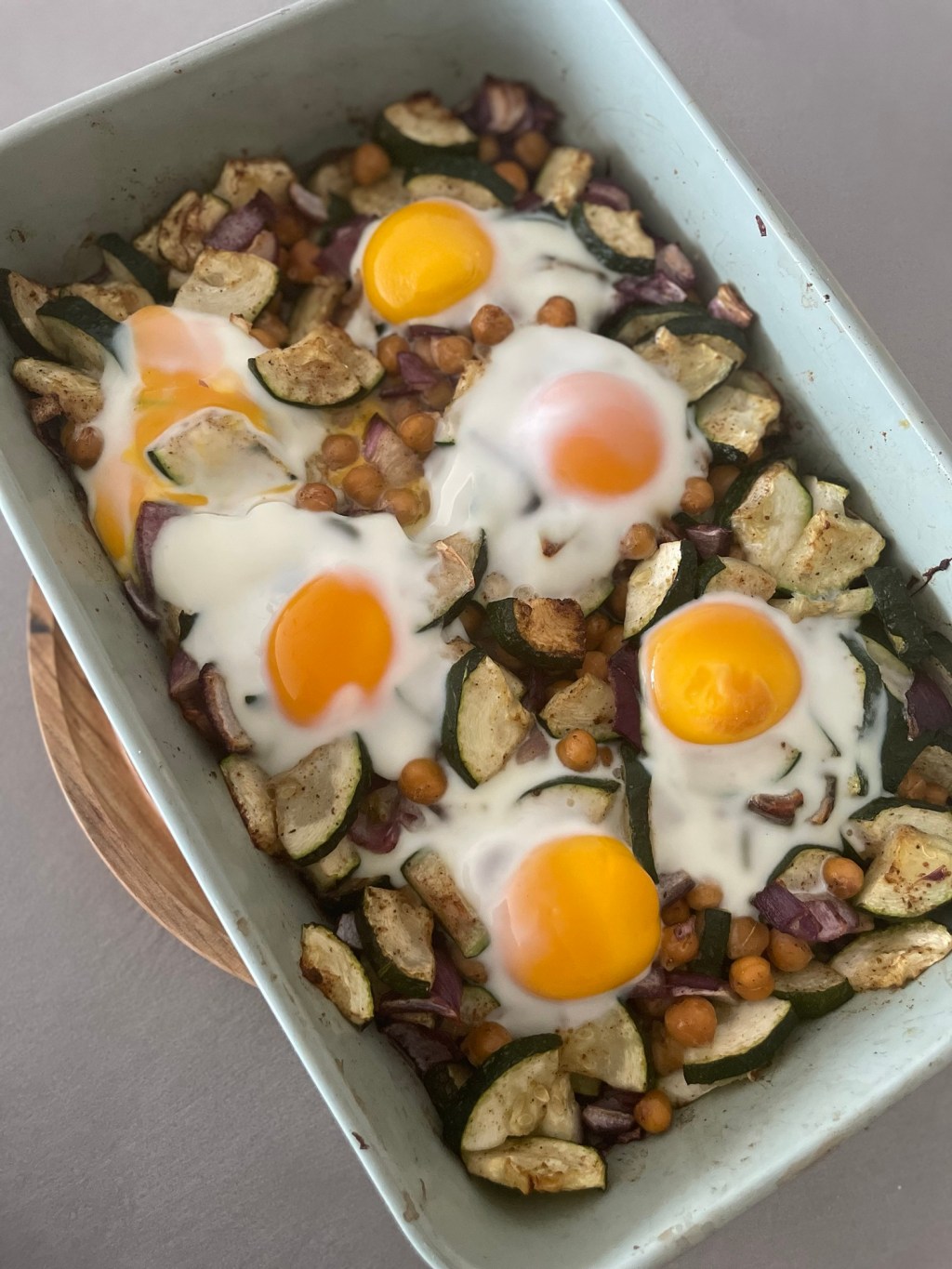 Einen Schuss Öl und die Gewürze dazu mischen und bei 180 Grad 20 Minuten in den Ofen geben. Kurz rausnehmen, Eier draufschlagen und nochmals 5-10 Minuten in den Ofen – bis die Eier durch sind.