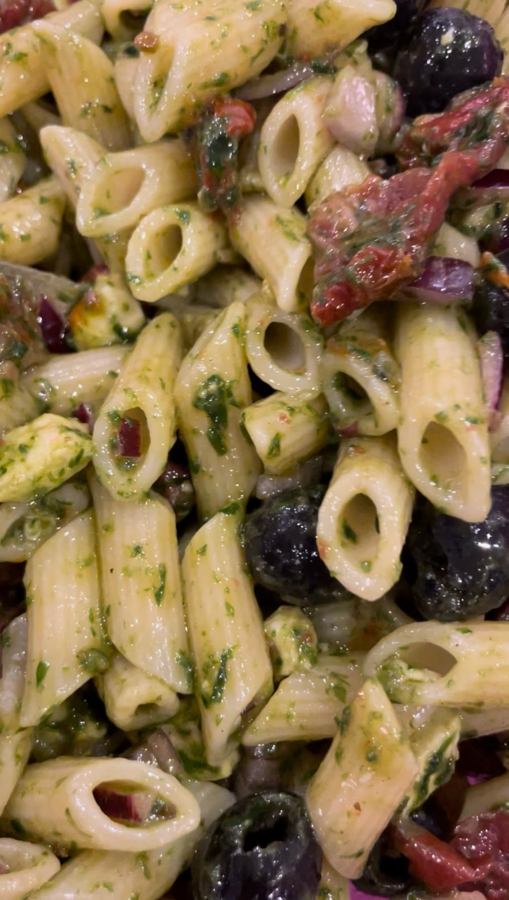 Nudeln mit kaltem Wasser abseihen, in eine große Schüssel geben und mit dem Bärlauchpesto, Öl und Essig vermengen, damit sie nicht zusammenkleben.