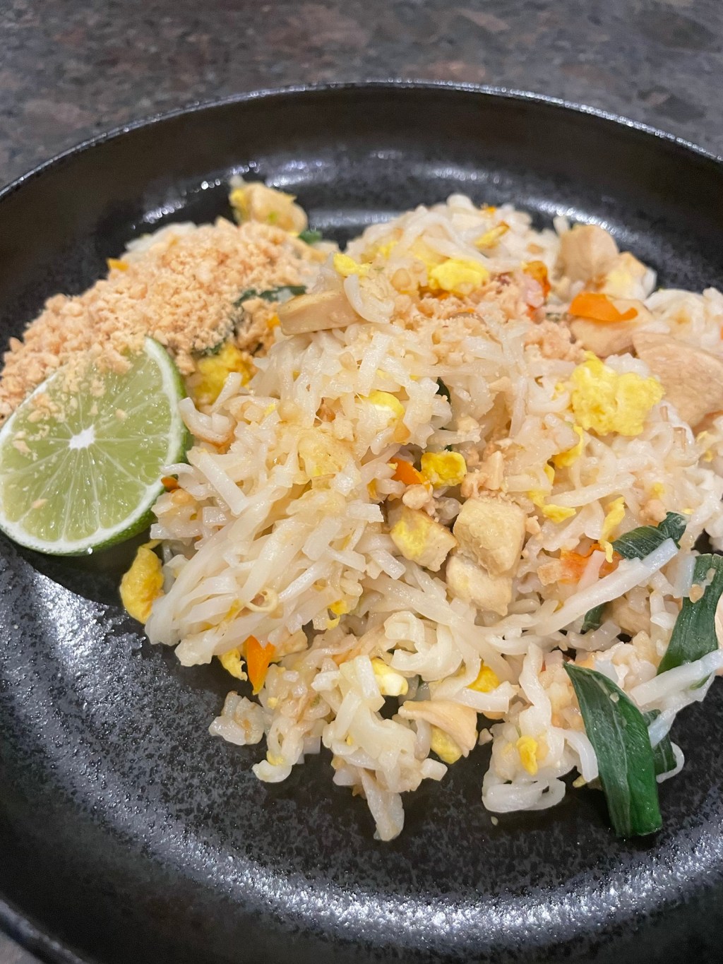 Das weiße der Jungzwiebel in Öl anschwitzen, dann das Fleisch dazugeben und anbraten. Die Nudeln und Karotten dazugeben, alles gut vermischen und mit der Sauce übergießen. Unter rühren die Nudeln weich werden lassen, zur Seite schieben, das verquirlte Ei eingießen, kurz stocken lassen und mit den Nudeln vermengen. Am Schluss noch die Mungbohnensprossen, die Erdnüsse und das Grüne der Frühlingszwiebel dazugeben und alles nochmals anrösten.