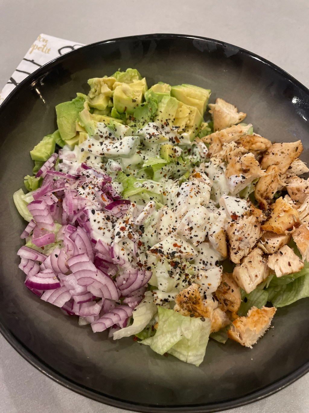 Salat, Zwiebel, Avocado und Hähnchen klein schneiden und in eine Schüssel geben. Für das Dressing Skyr, Öl, Essig, Wasabi, Wasser und Salz vermischen und über den Salat leeren. Gut durchmischen und genießen.